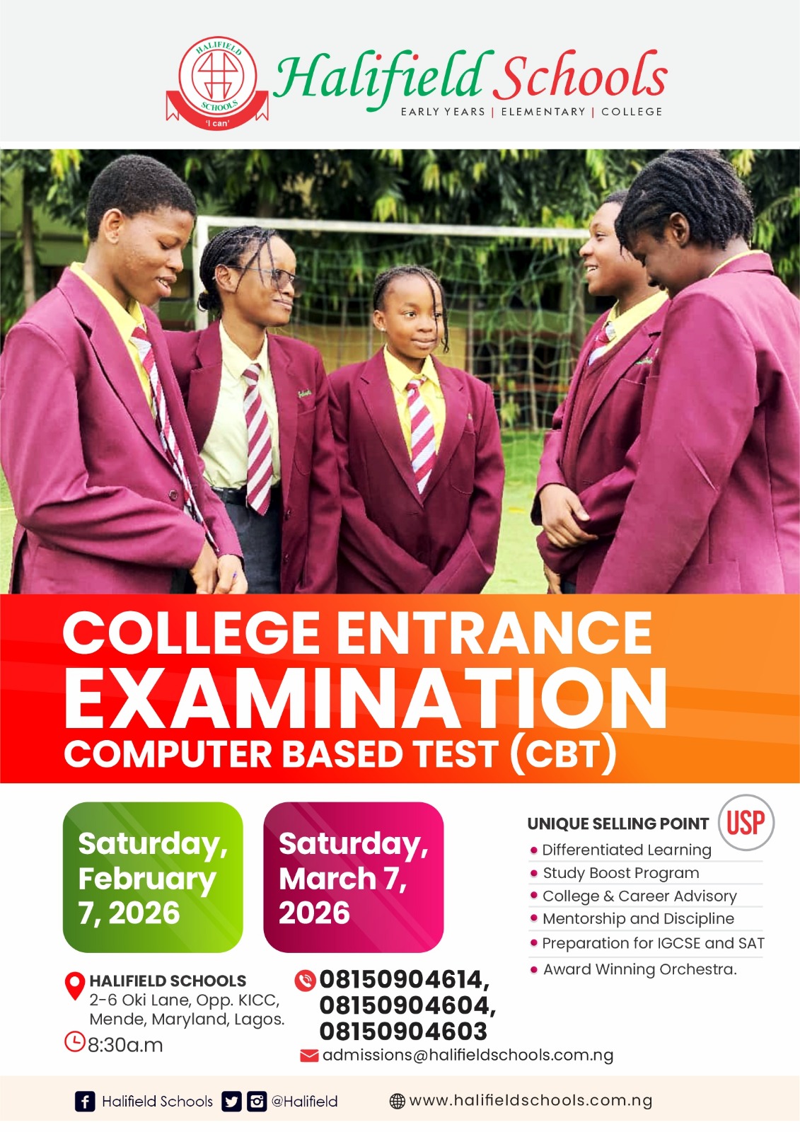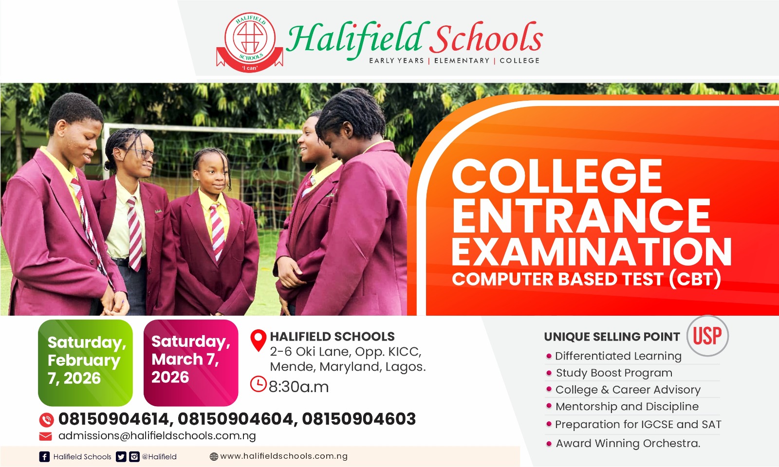 VENUE: HALIFIELD SCHOOLS 2-6 Oki Lane, Opp. KICC, Mende, Maryland, Lagos.